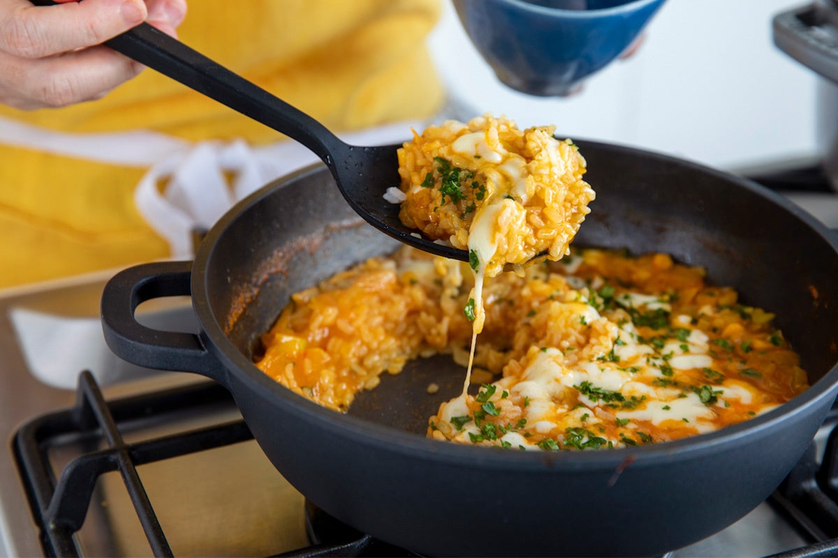 残った鍋から具を取り除いてごはんを加え、煮込む。溶けるチーズを加えてふたをして少し蒸らす。