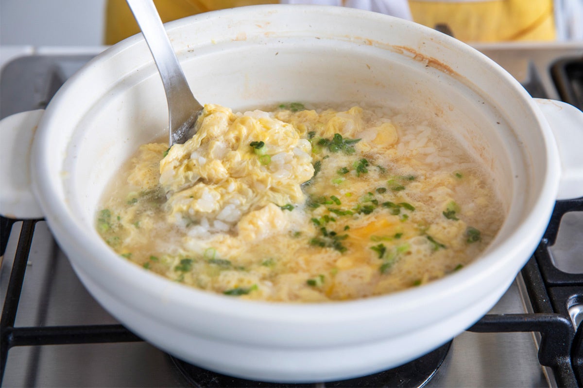 残った具材を取り除いて洗ったごはんを加え、煮立てる。味を見て醤油で調味し、溶きたまごを回し入れる。青ねぎを散らす。