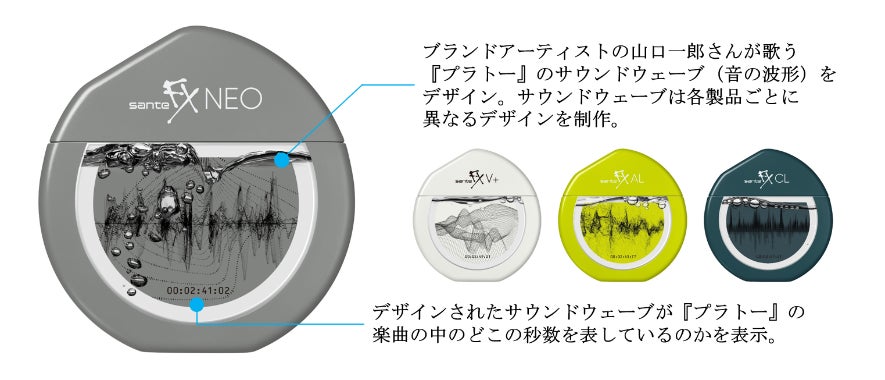 目薬容器のデザインにブランドアーティストである山口一郎さんがサンテFXのCMのために書き下ろした楽曲『プラトー』のサウンドウェーブ(音の波形)を施しました。サンテFXを持ち歩くことで、何事も前向きな気持ちで取り組みたい意識を持つ若者のチャレンジを応援するという『プラトー』に込められたメッセージを感じ取ってほしいという思いを表現しました。
