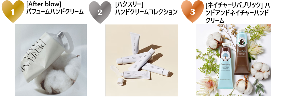 今回は、これからの季節に乾燥しがちな手の保湿ケア用品として、鞄に1つは入れておきたいマストアイテム『ハンドクリーム・ローション』の月間ランキングをご紹介します。1位は[After blow] パフュームハンドクリーム。厳選された自然由来成分を含むやさしい香り6種のラインナップ。香りが長続きし、ハンドケアを通してリラックス気分を味わえます。2位には[ハクスリー]からハンドクリームコレクションがランクイン。保湿力で手肌にやさしくなじみます。ベタつかず、さわやかでなめらかな塗り心地です。3位は[ネイチャーリパブリック] ハンドアンドネイチャーハンドクリーム。植物やフルーツの香りなど、14種から3種の香りが選べるセット商品です。その日の気分に合わせたハンドクリームを楽しめます。カラフルでナチュラルなテイストが印象的なパッケージも人気の理由です。今回は、韓国ブランドが上位を独占しました。乾燥対策だけでなく、香りが楽しめることもポイントになっているようです。疲れた手をケアしデイリーに使うアイテムとして、お気に入りの商品を探してみてはいかがでしょうか。