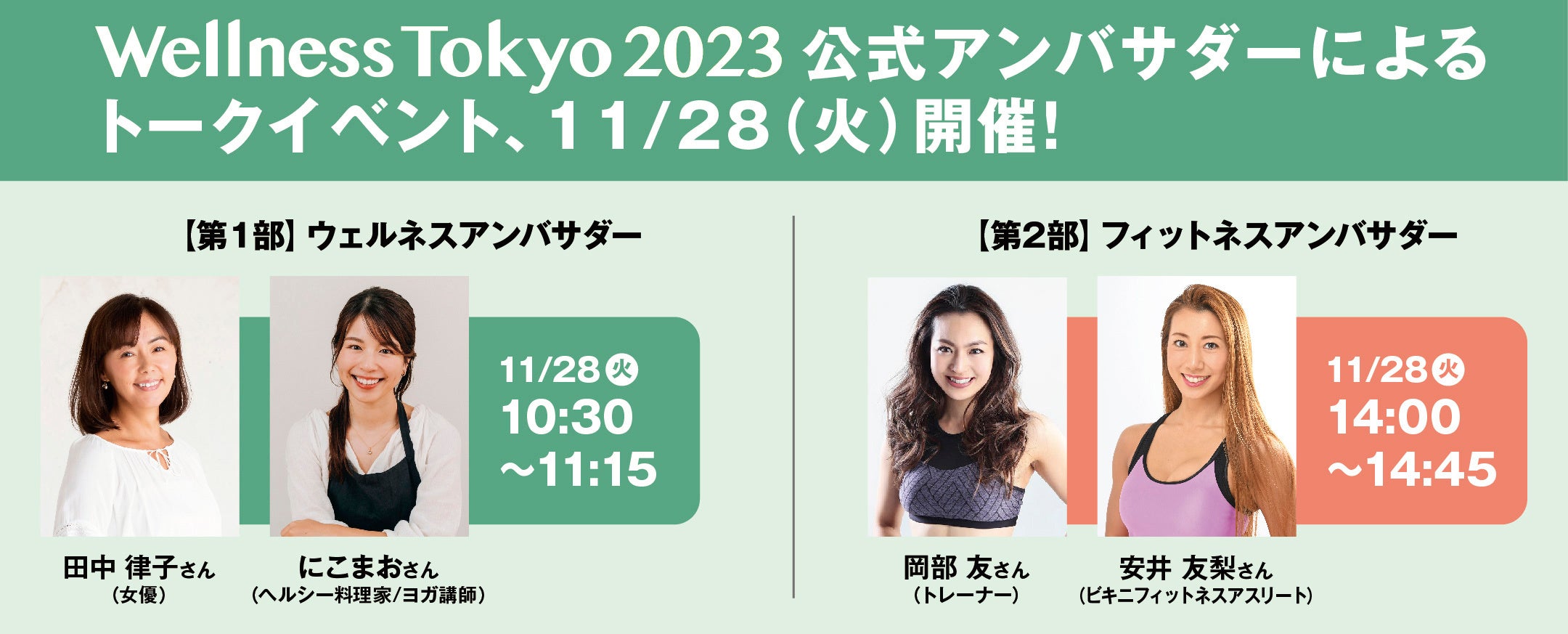 本展の公式アンバサダーとして⽥中律⼦さん、にこまおさん、岡部友さん、安井友梨さんの【今、最も健康的なライフスタイルを送る⼥性】として注⽬を集める中の4名が決定。会期初⽇に就任セレモニー&トークイベントを開催し、【⼼と体の健康のための展⽰会『Wellness Tokyo2023』】を盛り上げてまいります。