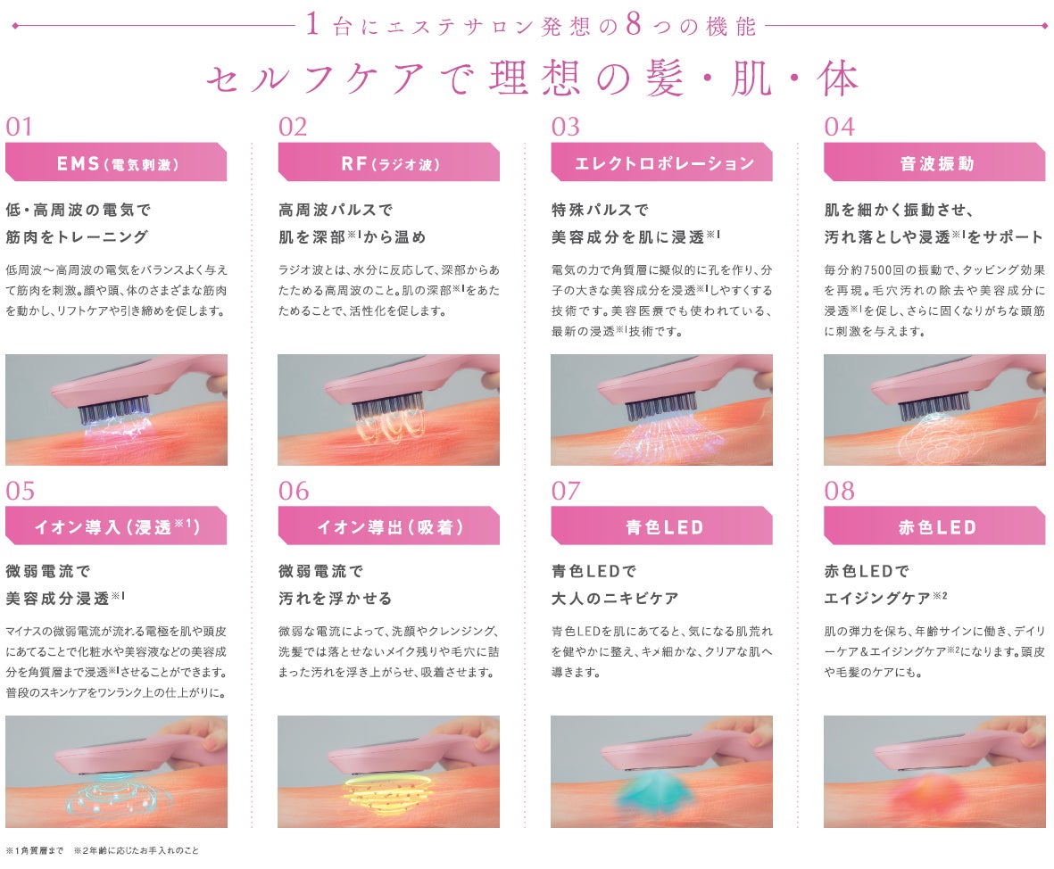 1台で頭皮・顔・体までエステサロンレベルのケアが可能で、①EMS(電気刺激)②RF(ラジオ波)③エレクトロボレーション④音波振動⑤イオン導入(浸透※)⑥イオン導入(吸着)⑦青色LED(ニキビケア)⑧赤色LED(エイジングケア)の8つの機能を持っています。