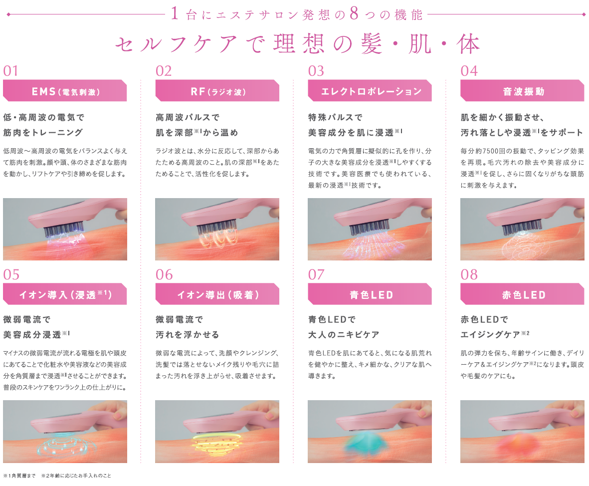 1台で頭皮・顔・体までエステサロンレベルのケアが可能で、①EMS(電気刺激)②RF(ラジオ波)③エレクトロボレーション④音波振動⑤イオン導入(浸透※)⑥イオン導入(吸着)⑦青色LED(ニキビケア)⑧赤色LED(エイジングケア)の8つの機能を持っています。