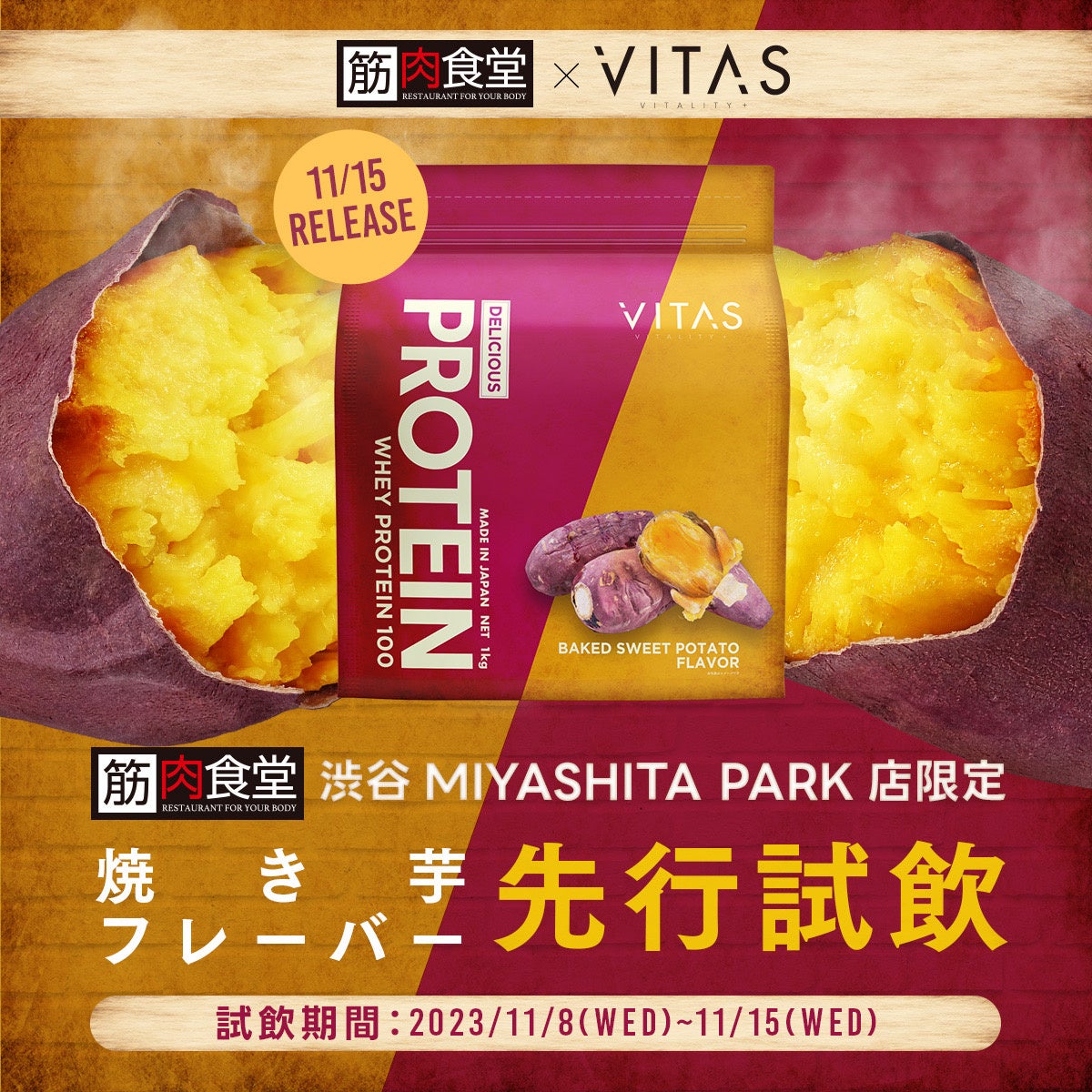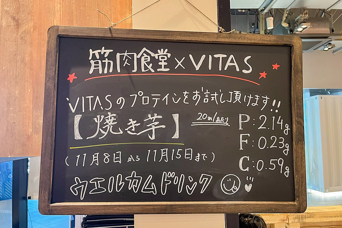 11月1日(水)より開催されている筋肉食堂×VITASコラボを記念して、筋肉食堂 渋谷MIYASHITA PARK店にてDELICIOUS PROTEIN 焼き芋フレーバーの先行試飲キャンペーンを、発売前の11月8日(水)から本日11月15日(水)までの期間限定で実施しております。