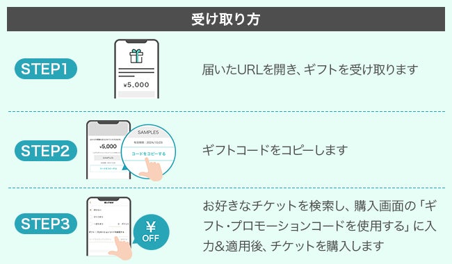 『キレイパスギフト』は、感謝やお祝いの気持ちを伝えるオリジナルのメッセージを添えて、「キレイパス byGMO」で使えるギフトコードを贈ることができる機能です。相手の住所を知らなくても、連絡先を知っていればLINEやメールなどで気軽に贈ることができます。ギフトを受け取った方は、購入画面でギフトコードを入力すると、受け取ったギフトの金額分を差し引いた価格でチケットを購入できます。なお、ギフトコードの利用対象は「キレイパス byGMO」に掲載されている全てのチケットです。