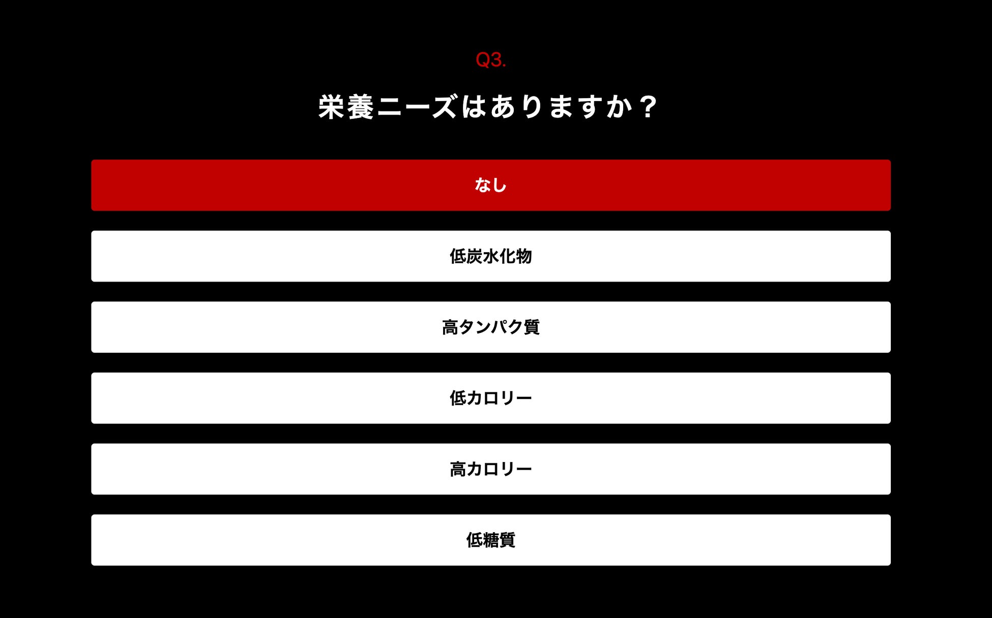 「低糖質」「高タンパク」「低カロリー」「高カロリー」など、あなたの食事の好みや目標に合わせたオプションを選択できます。これにより、ダイエット中の方や体づくりをしている方など、異なる栄養摂取のニーズを持つユーザーに対応ですることができ、それに合致したレシピを提案することが可能になります。