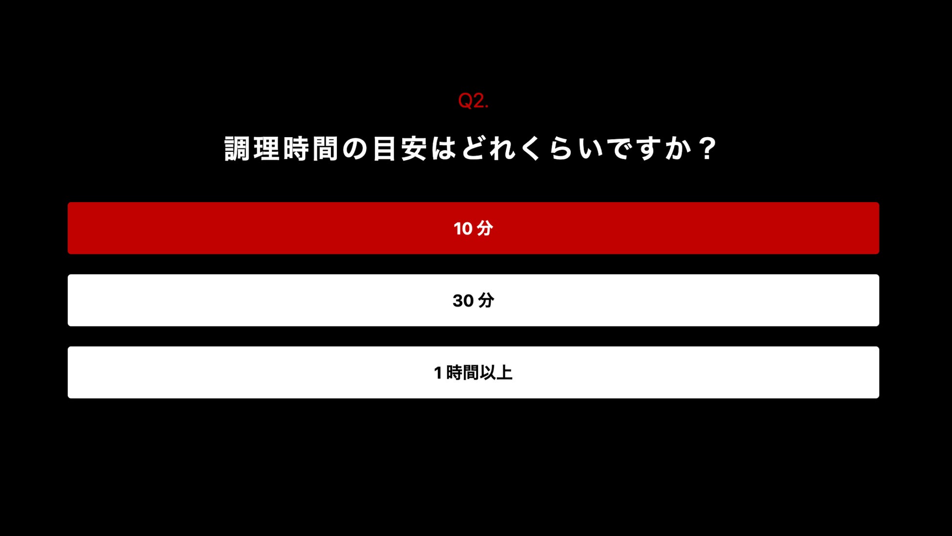 調理時間を「10分」「30分」「1時間以上」の3つの選択肢から選択できるので、あなたのスケジュールや都合に応じて、最適な調理時間のレシピを入手することができます。例えば、忙しい日には短時間で完成できる10分で調理できるレシピを選択することで、手軽に美味しい食事を楽しむことができます。