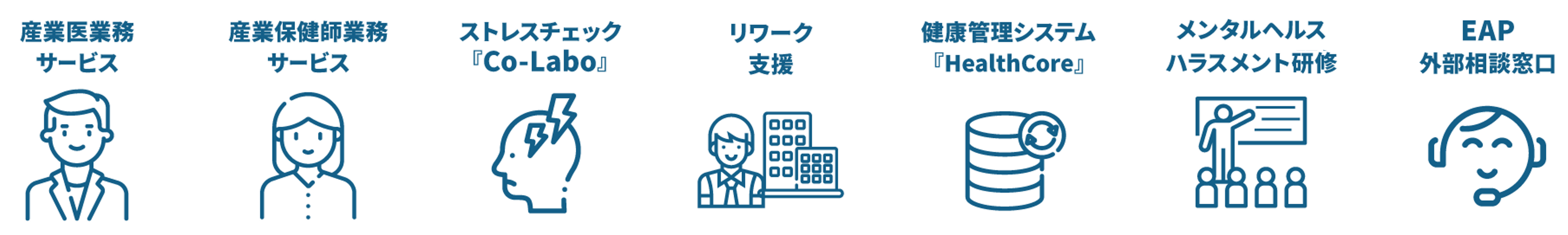 『産業保健トータルサポート』では、医師紹介業20年のノウハウとネットワークによる産業医紹介・選任後の業務サポートをはじめ、ストレスチェック『Co-Labo』、産業保健師サービス、EAP外部相談窓口、メンタルヘルス・ハラスメント研修、専門家相談サービス等で、企業の健康経営を総合的に支援しています。