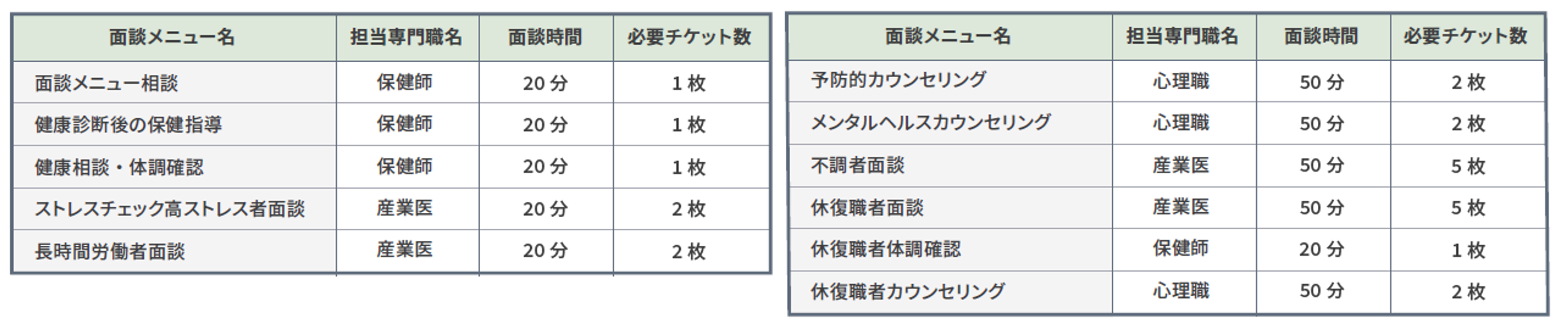 ・多職種の専門職チームによる全11メニュー:産業医、保健師、心理職による豊富な面談メニューを用意しています。
