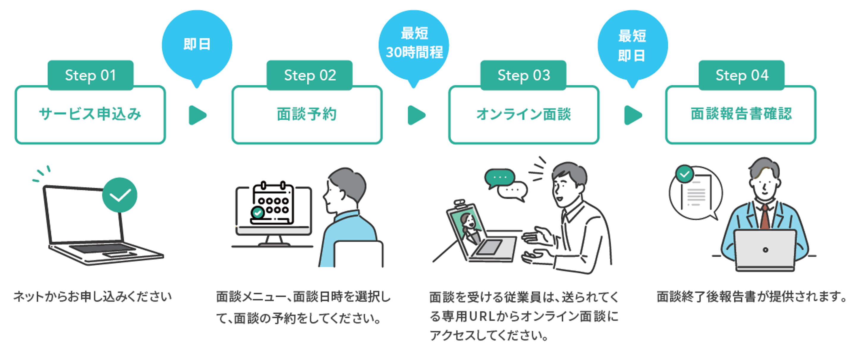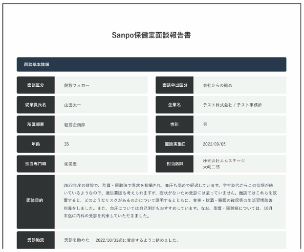 産業保健専門職オンラインシェアリングサービス『Sanpo保健室』は、その時必要な情報や対応に合わせて、産業医や保健師など多職種の専門スタッフが実施する面談メニューを選び、オンラインにて面談ができるサービスです。メンタルヘルス不調者や休復職者が突発的に発生し、どうしたらよいか分からない。長時間労働が常態化しているが、医師面接指導の実施義務を果たせていない。リモートワークなど遠隔での業務が増え、従業員のメンタル面や体調不良が心配。など、全11種の豊富なメニューと、その後の対応へのアドバイスを含めたフィードバック(面談報告書)で、人事労務ご担当者が抱える様々な課題に対応します。