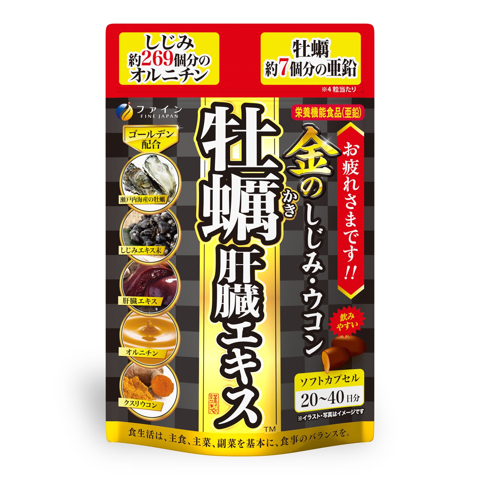 豚のレバーを使用した肝臓水解物をはじめ、1袋当たりしじみ約116個分の国産のしじみエキス、クルクミンと亜鉛、オルニチンを黄金配合し、イキイキと生活したい人々をサポートします。夜のお付き合いが長い方だけでなく、元気が欲しい方や毎日を健康に過ごしたいという方にもご利用いただきたい商品です。