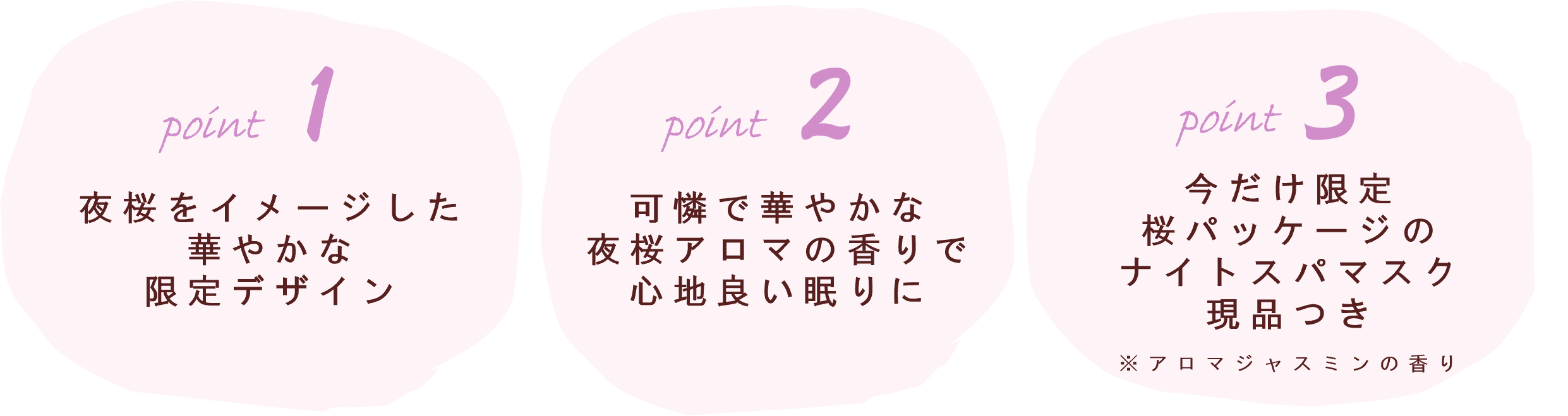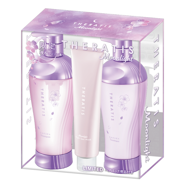 シャンプー、ヘアトリートメントに桜パッケージのナイトスパマスク現品がついた限定のトリプルセット。夜桜をイメージした春限定のナイトケアセットです。