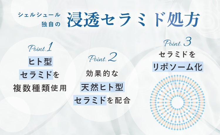 ヒト型セラミドをリポソーム化し、シェルシュールの独自処方で配合。うるおいを長時間持続するとともに、角層の隅々まで浸透し、インナードライ肌を内側からうるおいで満たします。