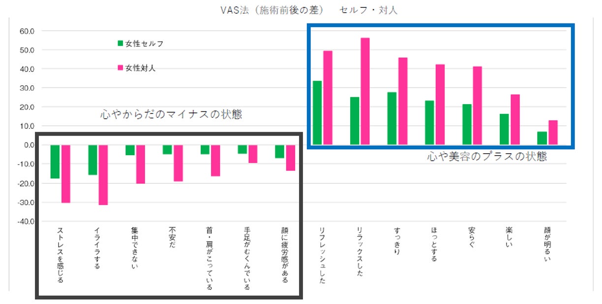 ②セルフでも対人でも、トリートメント後には、心身の状態を示すマイナス項目は減少し、プラス項目は増加する傾向が得られた。セルフよりも対人の方が、マイナス項目の減少率、プラス項目の増加率が大きい傾向が得られた。