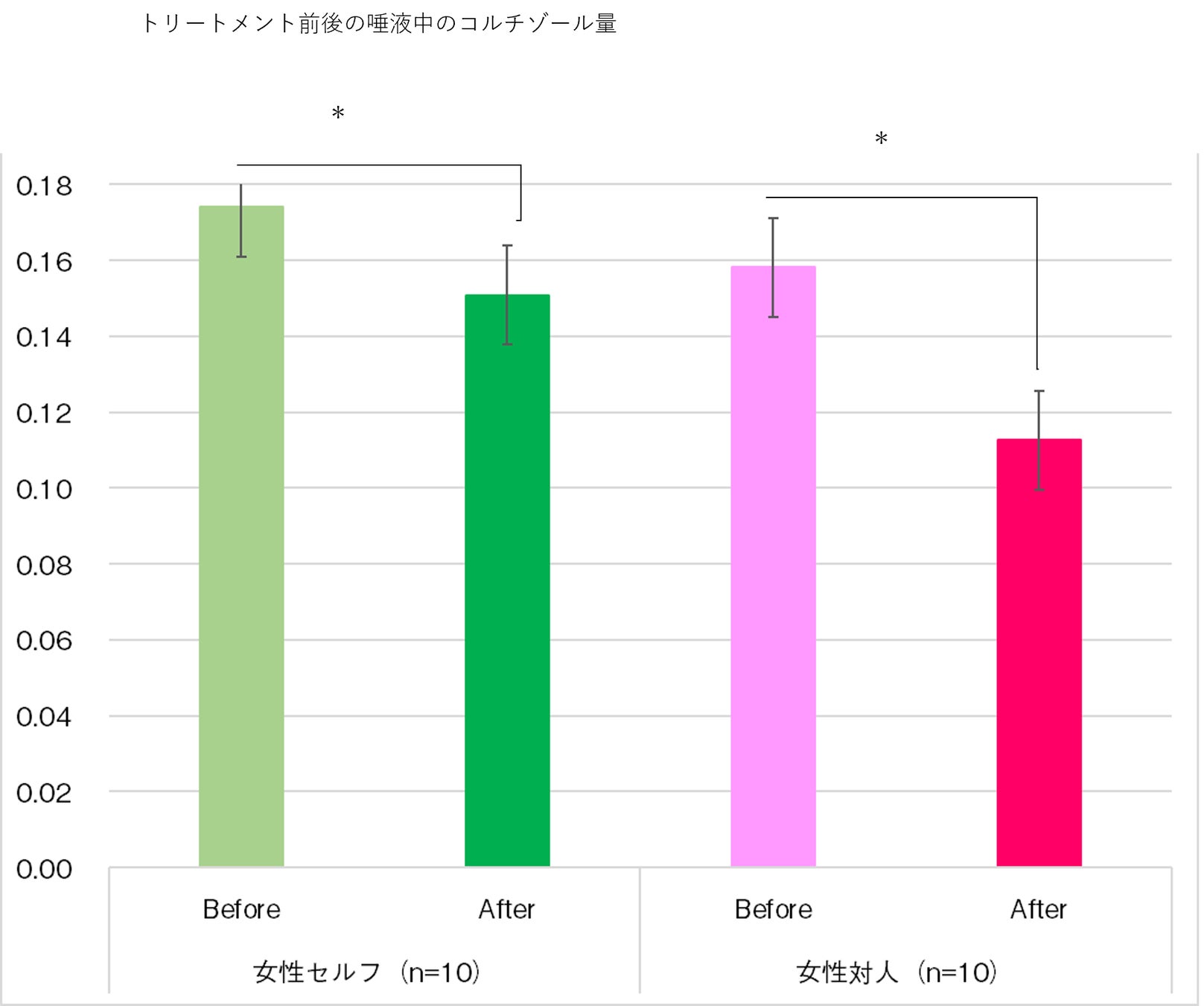 20~50歳の女性10名を対象に、自分で行うトリートメントと、他者にトリートメントを実施してもらう対人トリートメントを体験いただき、ストレスホルモンであるコルチゾール量の変化と心身の状態の変化を調査。