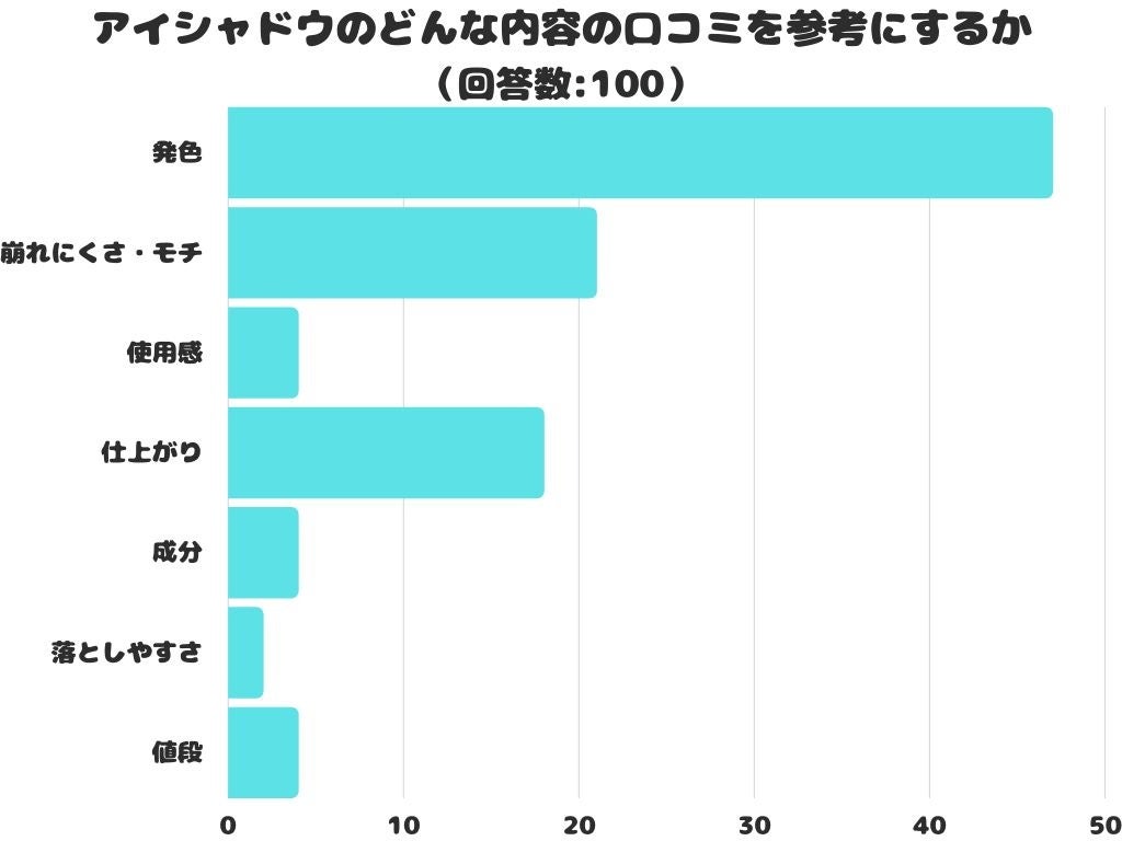 アイシャドウのどんな内容の口コミを参考にするかをアンケートにて調査したところ、1位は「発色」でした。