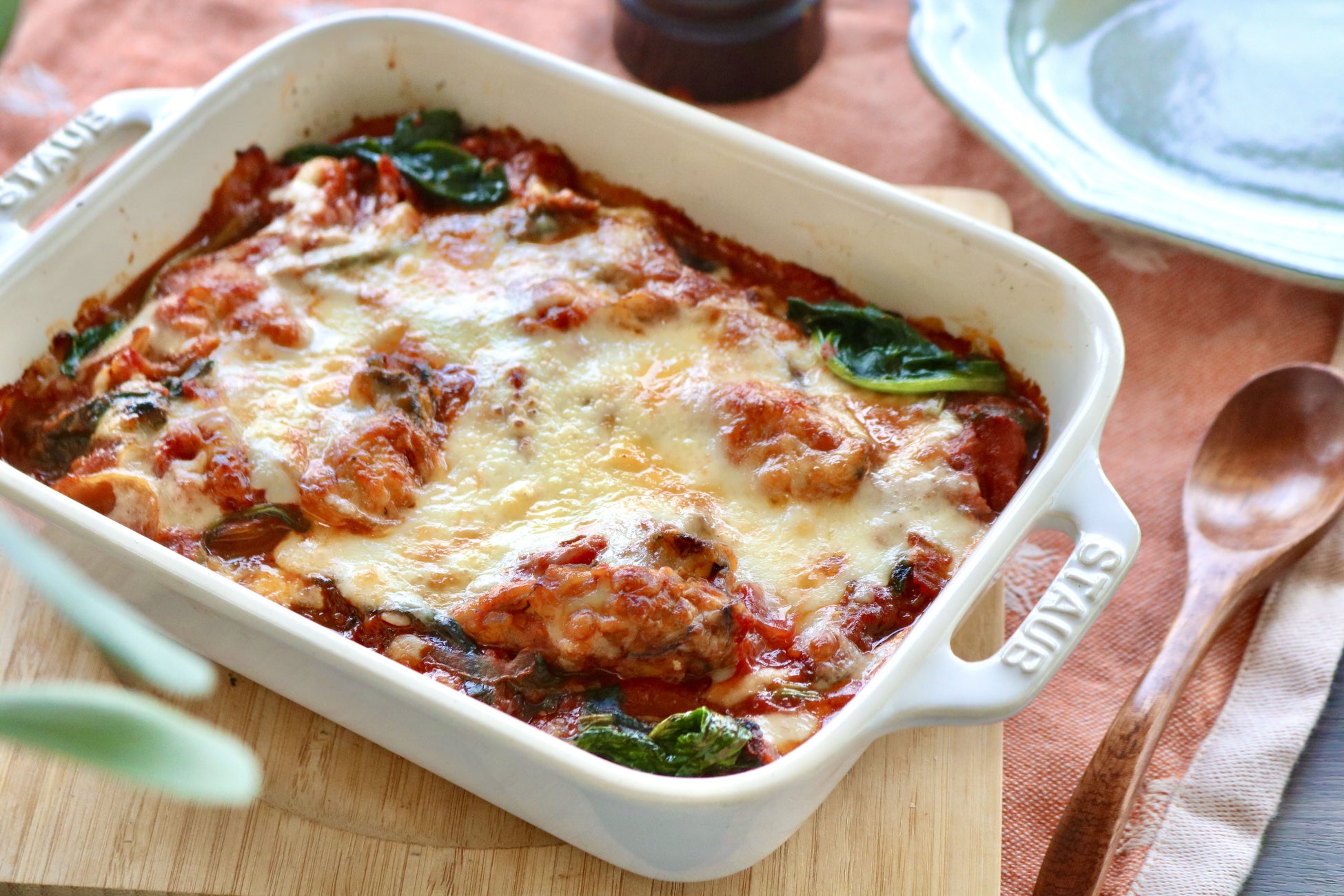 ④ ほうれん草を加えさっと混ぜ、耐熱皿に入れ、ピザ用チーズをかけたらトースター(1000~1200W)やオーブン(250℃)で10分程度、チーズが香ばしく色づくまで焼く。