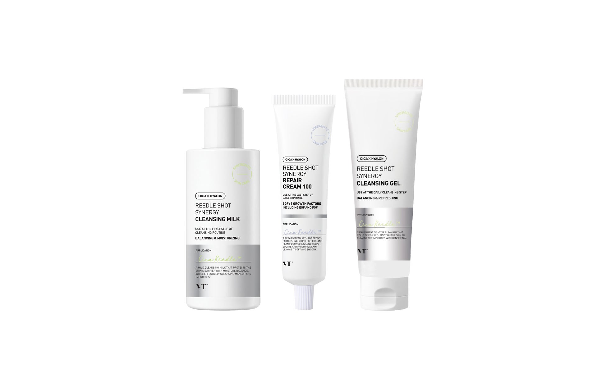 [写真]NEW (左から) リードルショット シナジークレンジングミルク、リードルショット シナジー リペアクリーム100、リードルショット シナジー クレンジングジェル