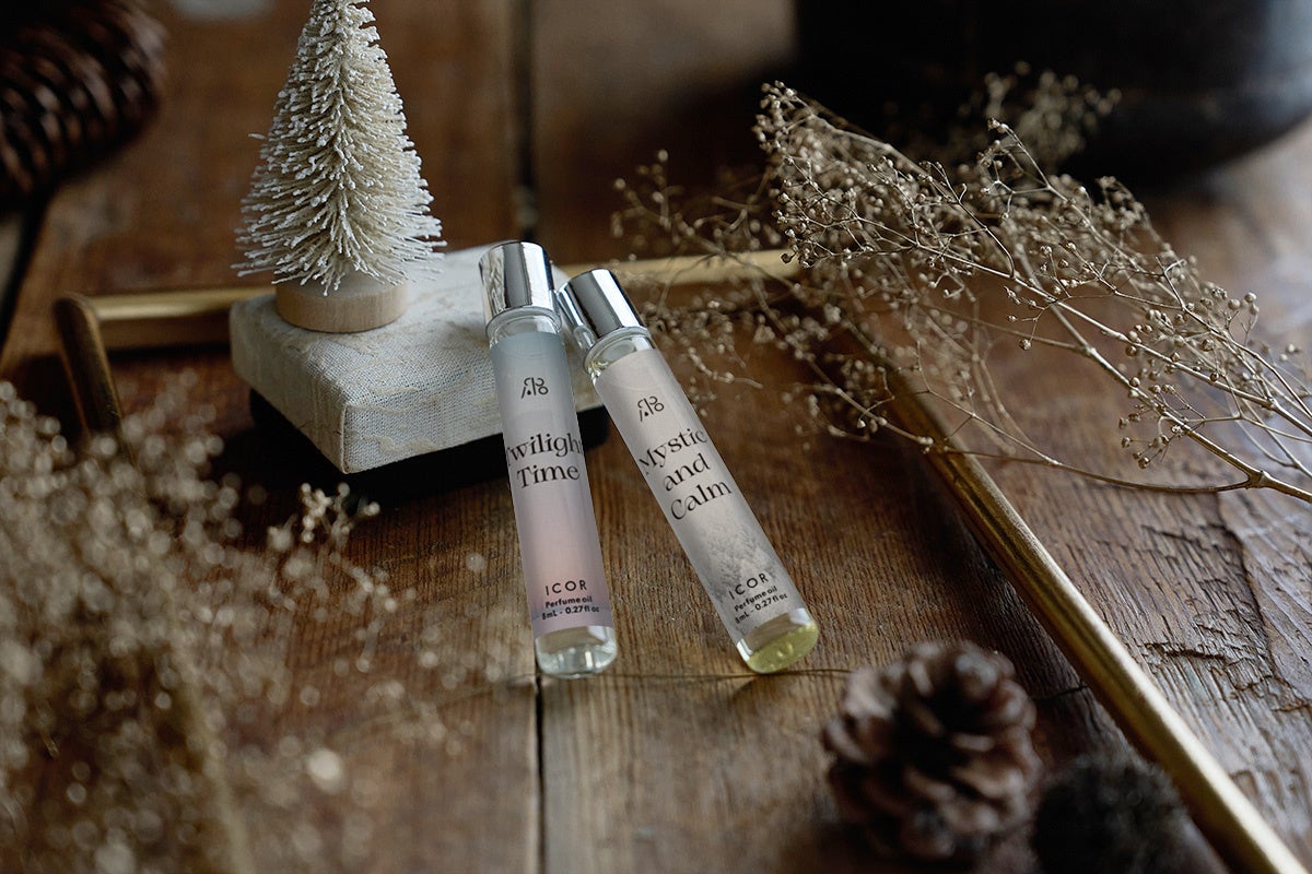 スキンケアも叶えるアロマ美容オイル2種を限定発売。冬を彩る香りと潤いのハーモニー、オリジナルブレンドのロールオンパフュームオイルがICOR新登場!