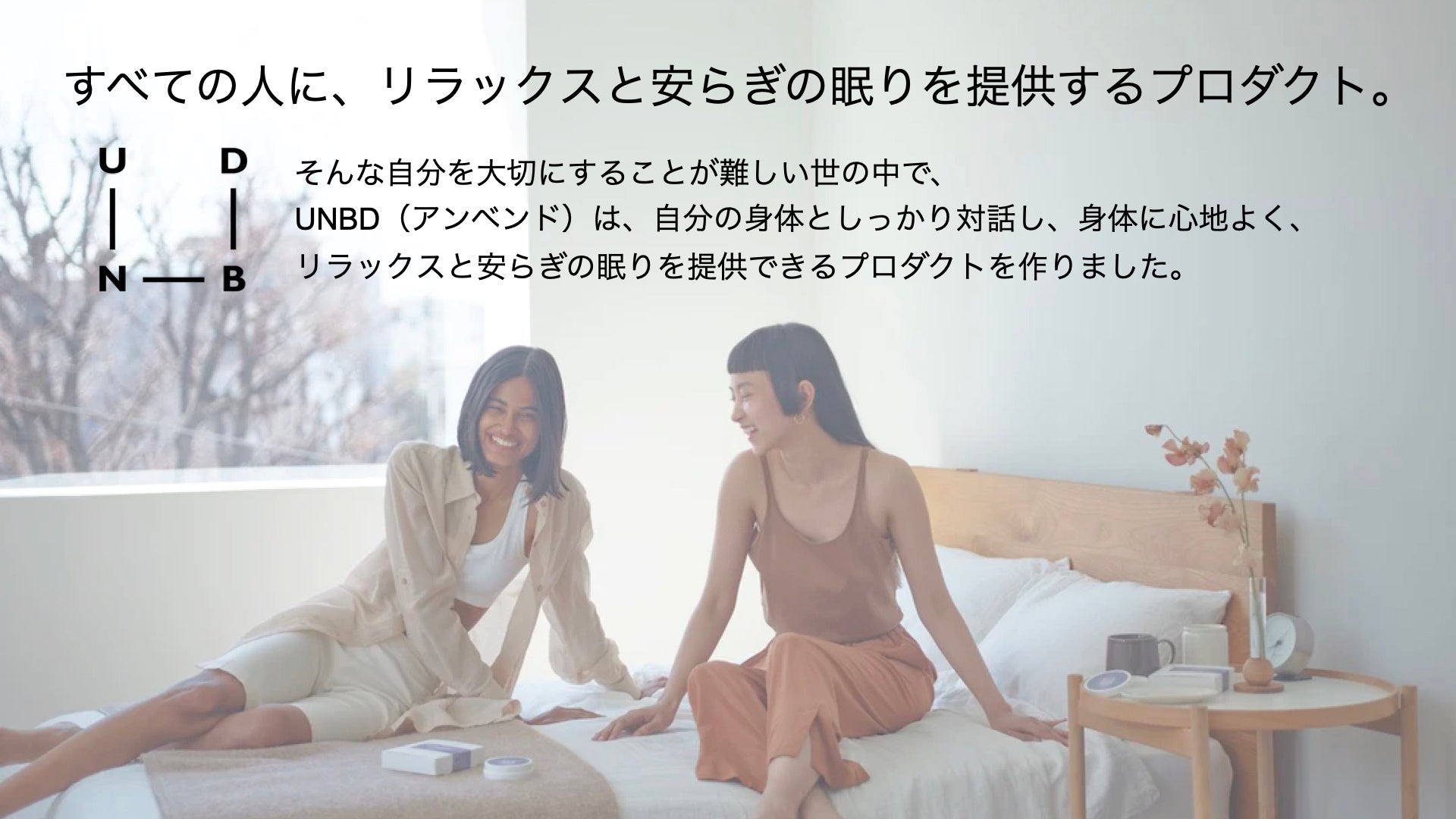 このような社会問題を解決すべく、アンベンドは、「すべての人に、リラックスと安らぎの時間を」をコンセプトに、⾃分の⾝体としっかり対話し、⾝体に⼼地よい時間を提供できる商品づくりを行なっております。