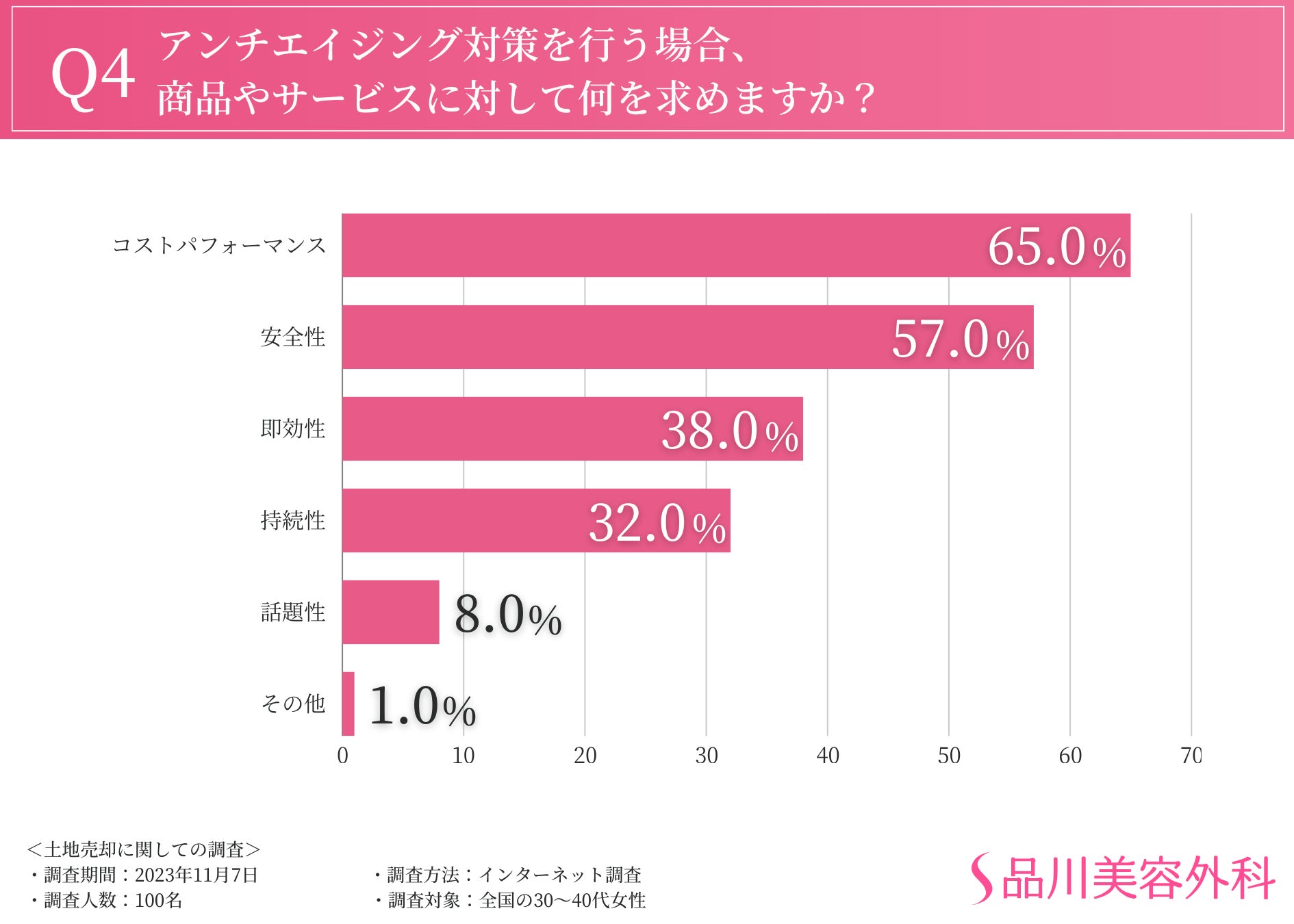 そこで、アンチエイジング対策を行う場合、商品やサービスに対して何を求めるか伺ったところ、「コストパフォーマンス(65.0%)」「安全性(57.0%)」という声が集まりました。