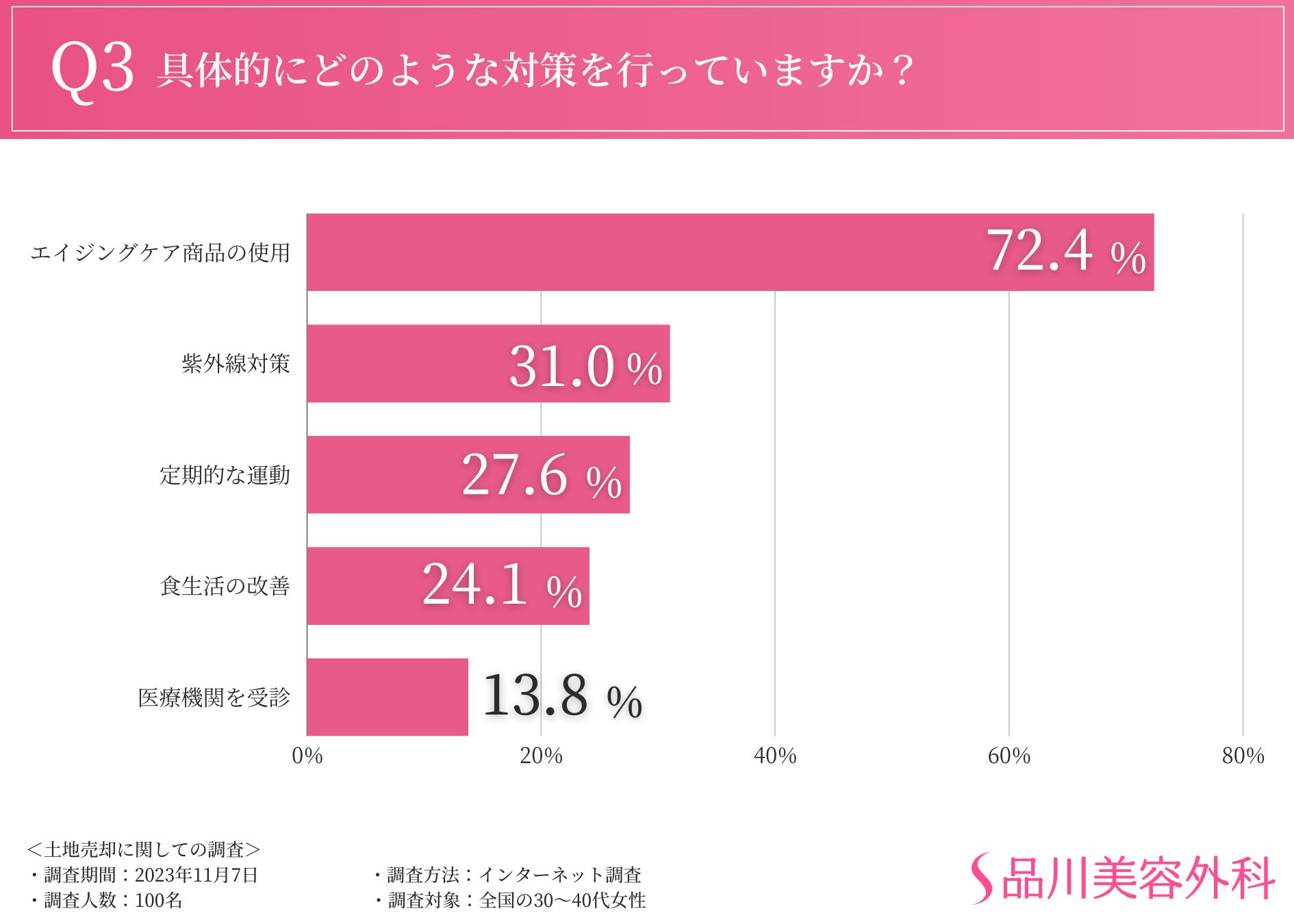 伺ってみたところ、「エイジングケア商品の使用(72.0%)」と回答した方が最も多い結果となりました。
