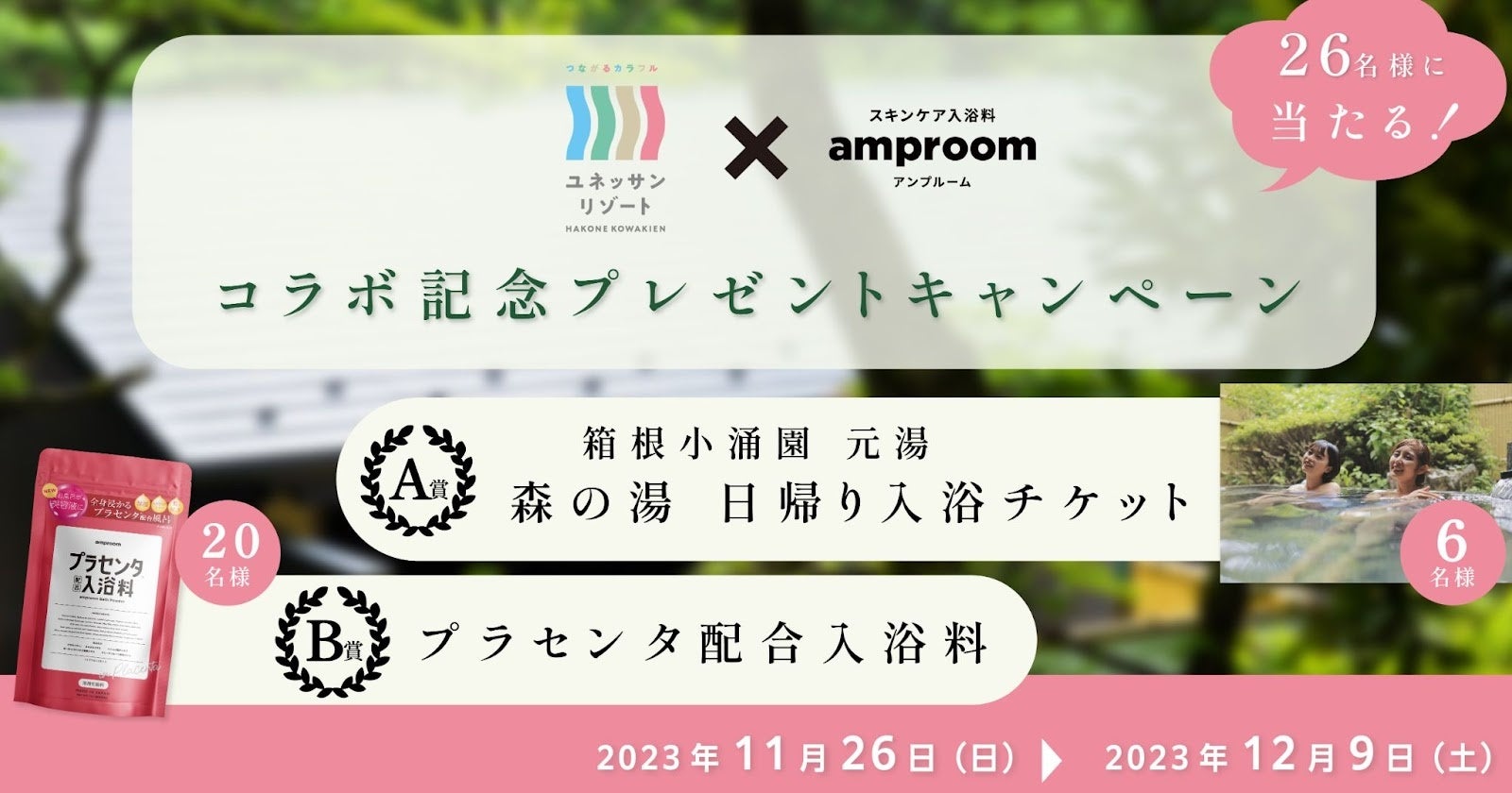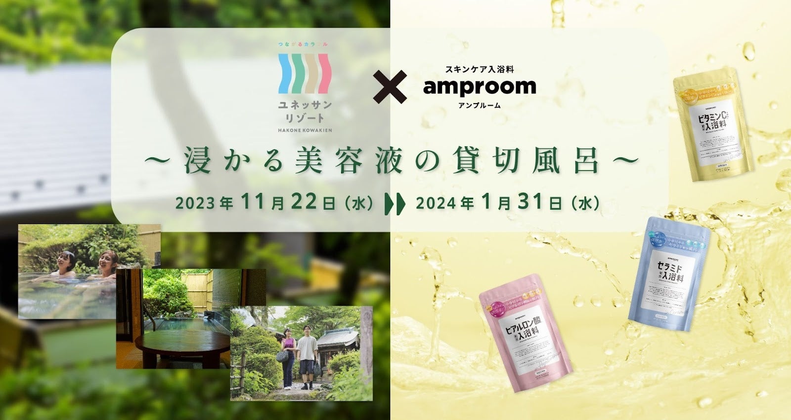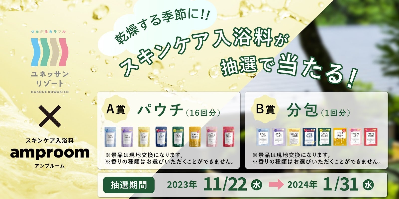 箱根外輪山の景色を望める露天風呂に、落ち着いた雰囲気の内湯。都会の喧騒から離れ、ゆったりお風呂を楽しむことができる「元湯 森の湯 別邸やすらぎ」3部屋のお風呂でamproomを堪能できます。また、コラボ期間中はamproomスキンケア入浴料がその場で当たるキャンペーン、SNSキャンペーン、森の湯売店・売店コーナーでamproomをご購入いただけます。