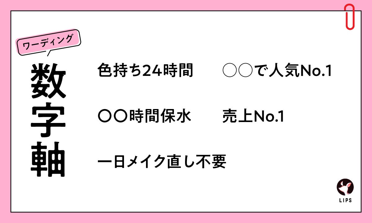 “色持ち24時間“や”一日メイク直ししなくていい”など数字がくると、具体的にイメージしやすく購買につながるようです。また、数字軸で上記にあげられたもの以外にも”LIPS殿堂入り“や”〜受賞”などもありました。信用度が増す商品ランキングも購買に効果的であることは間違いなさそうです。