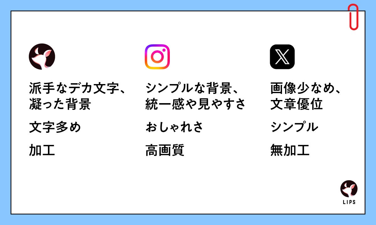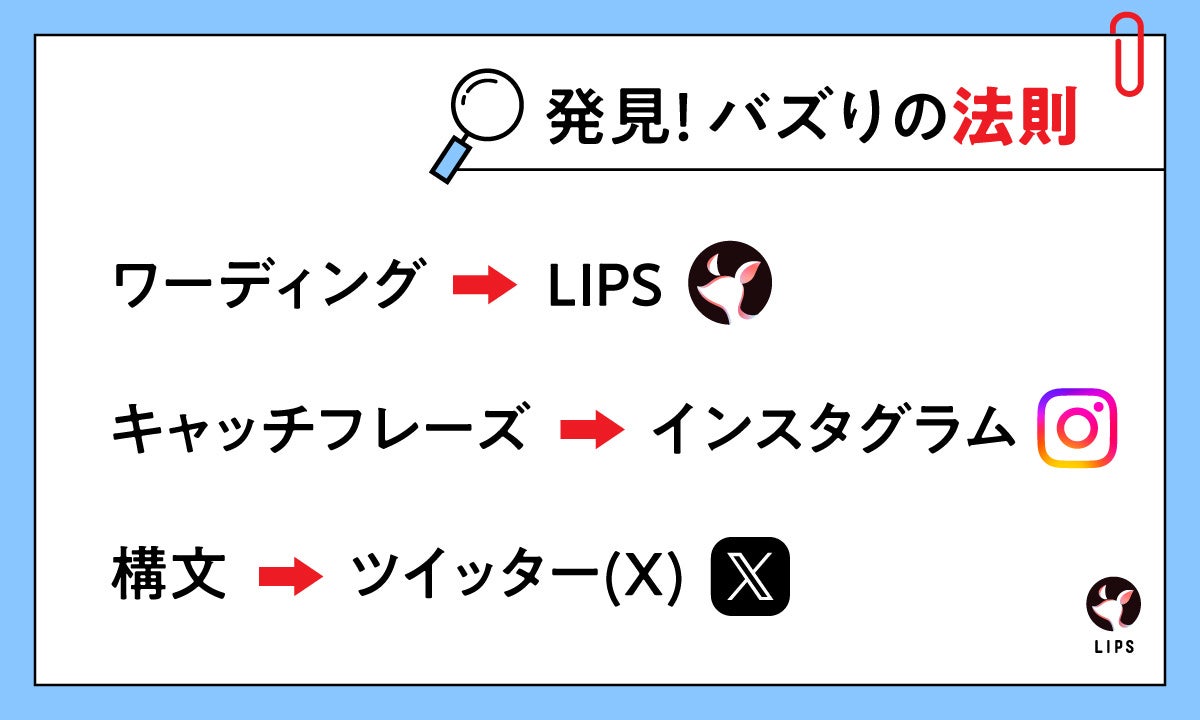それぞれのSNSでバズる言葉を切り口にすると、LIPSは短いワーディング、Instagramはキャッチフレーズ、X(旧Twitter)は構文と相性がいいのかもしれません。SNS毎に訴求方法を変えていくことで、次のバズにつながりそうですね。