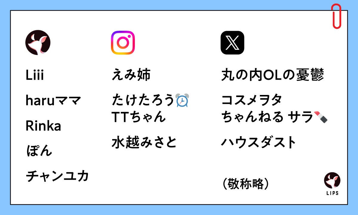 最後に、LIPSユーザー視点でバズりが生まれやすい印象のアカウントをSNS別に集計しました。(以下敬称略)