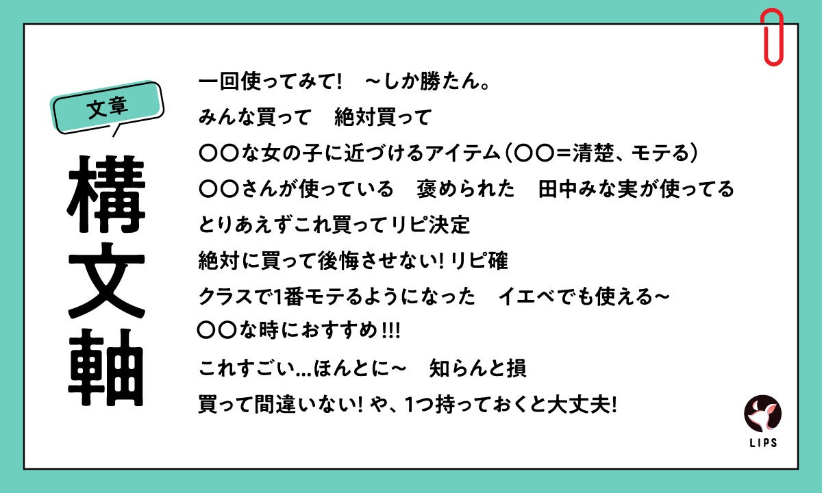 逆説を使った構文や、使った後の効果を含んだ構文、”絶対”や”間違いない”など断定して誰かに強くおすすめするような定型的なフォーマットがあるようです。