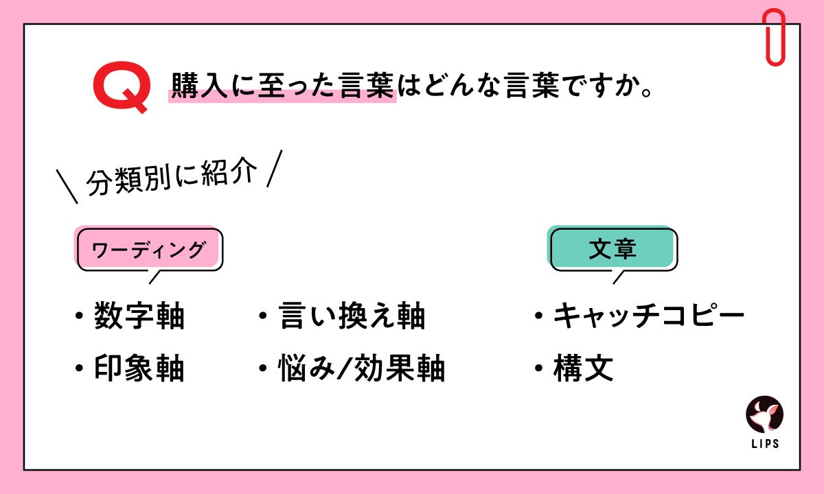 「購入に至った言葉を教えてください」という問いに対する実際のユーザーの声を大きく“ワーディング”と“文章”に分けて調査していきます。