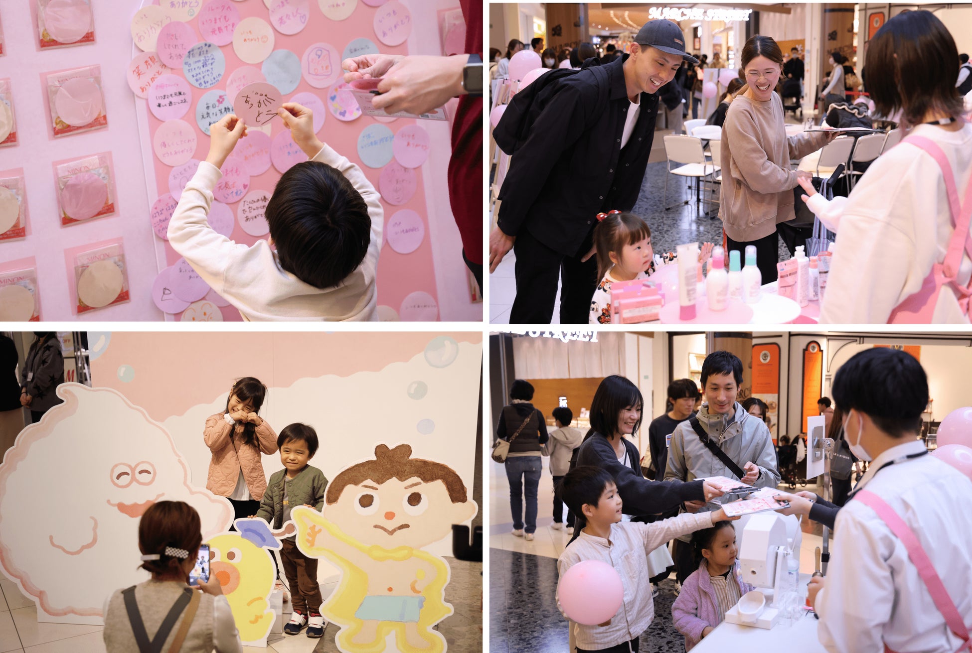 会場にはお子さまやそのご家族にスキンケアの大切さを楽しく学んでいただくためのオリジナル絵本『あわあわ もこもこ にこにこ のん』の世界観を表現したフォトスポットも設置。多くのお子さまが絵本に登場する“もこのん”や“ゆうちゃん”との記念撮影をされていました。