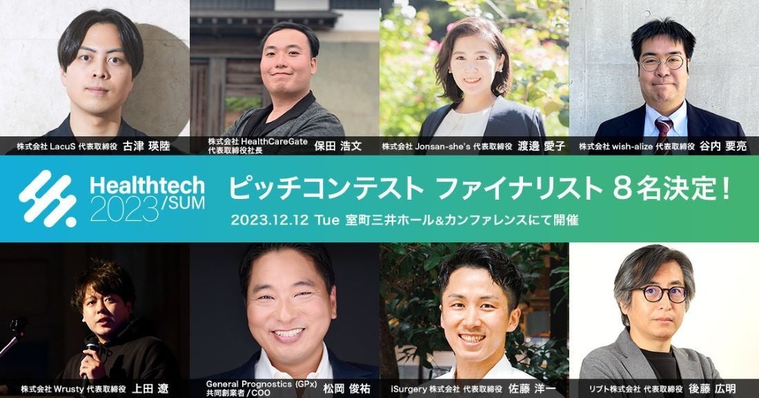 この度「Healthtech/SUM」のメインイベントである「Pitch Final(決勝戦)」(以下ピッチコンテスト。詳細URL:https://www.healthtechsum.jp/pitch.html)のファイナリストが決定いたしました。ファイナリストには、書類審査と日本経済新聞の読者様をはじめとしたオンライン投票により8社(8名)が選ばれています。
