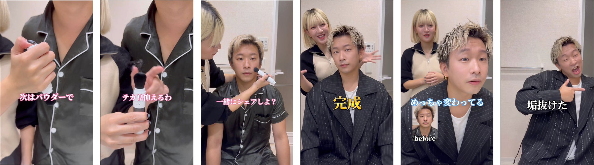 続いてBBのメイク崩れと皮脂テカリ防止のためにKAKTASのパウダーを使う。ボタンをプッシュして、ブラシからパウダーの噴射が確認できたらOK。ユウマの肌へブラシを優しく撫でていく。場所を選ばず使いやすいため2人でシェアして使うことを約束。最後に髪をセットして垢抜け完成。肌の変化にユウマも大満足。このまま2人はデートへ!