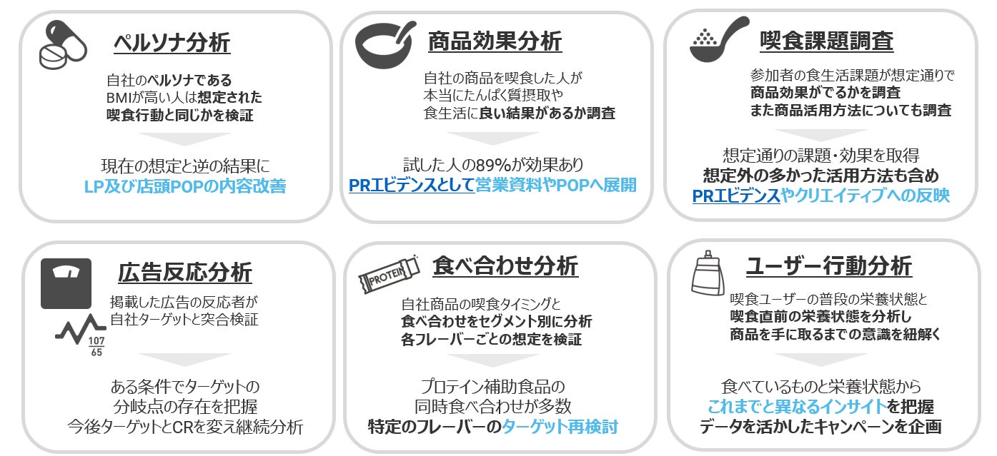 アンケート調査の結果と回答者の喫食データを掛け合わせた分析も行うことで、食に関する定量・定性双方のデータ分析が可能になります。例えば、ペルソナに絞ってアンケートを実施して想定された喫食行動と同じか検証する「ペルソナ分析」や、自社商品の喫食ユーザーに対し、アンケート回答に加え栄養摂取状況を合わせて分析することでより効果を見える化する「商品効果分析」、同じ食生活課題をもつ参加者に対して商品をどのように活用して課題を解決するかを調査する「喫食課題調査」などが可能です。
