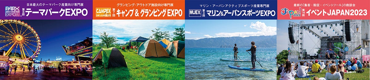 『レジャー&アウトドアジャパン2023』は、本展を含めた4つの専門展で構成されています。日本各地で新たな施設のオープンや新エリア・アトラクションの導入が続くテーマパーク産業に特化した展示会や、東京オリンピック種目に選定されたことも大きく影響し、ここ数年で市場が拡大しているアクティブスポーツに関する専門展にも多くの企業が出展。また同時開催展として、アフターコロナで復活が見込まれるイベント産業向けの展示会も開かれ、合計20,000名の来場者が体験・商談を行う画期ある3日間となります。各展は一つの入場バッジですべて相互入場可能です。