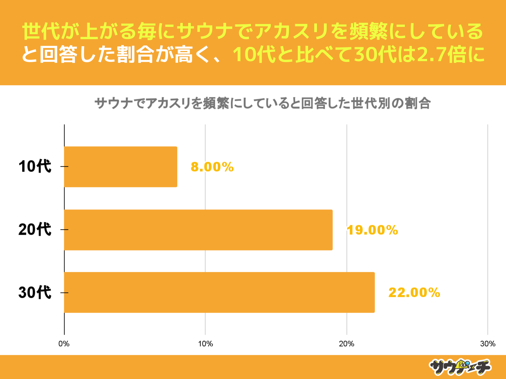 サウナでアカスリを頻繁にしていると回答した割合を世代別でみてみますと、30代の22%が最も高く、次いで20代の19%、10代が8%で、10代と比べて30代は2.7倍高い結果となりました。