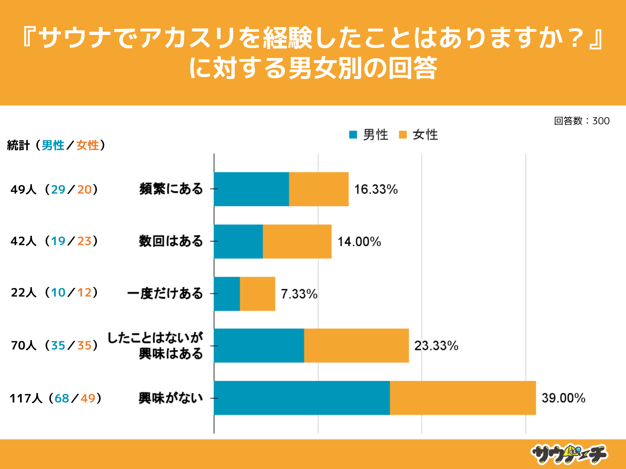 10代〜30代男女を対象とした『サウナでアカスリを経験したことはありますか?』というアンケートで、最も多かった回答は「興味がない」で39%でした。