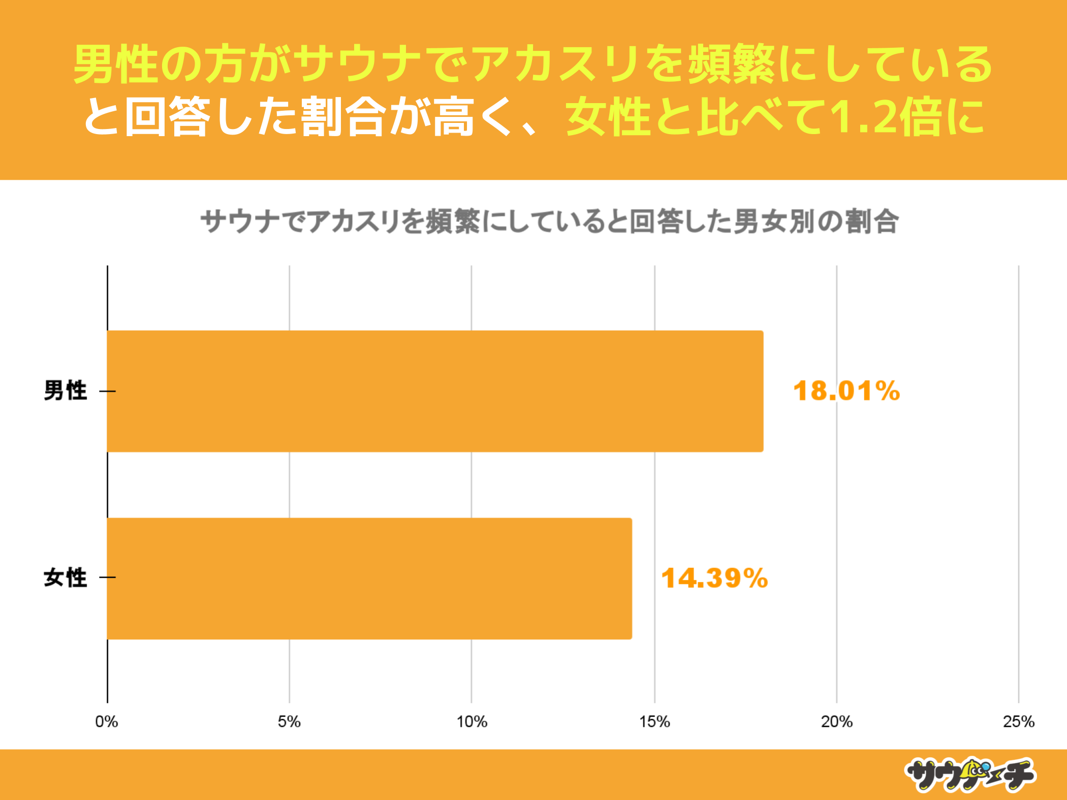 サウナでアカスリを頻繁にしていると回答した割合を男女別でみてみますと、男性が18.01%、女性が14.39%で、女性と比べて男性は1.2倍高い結果となりました。
