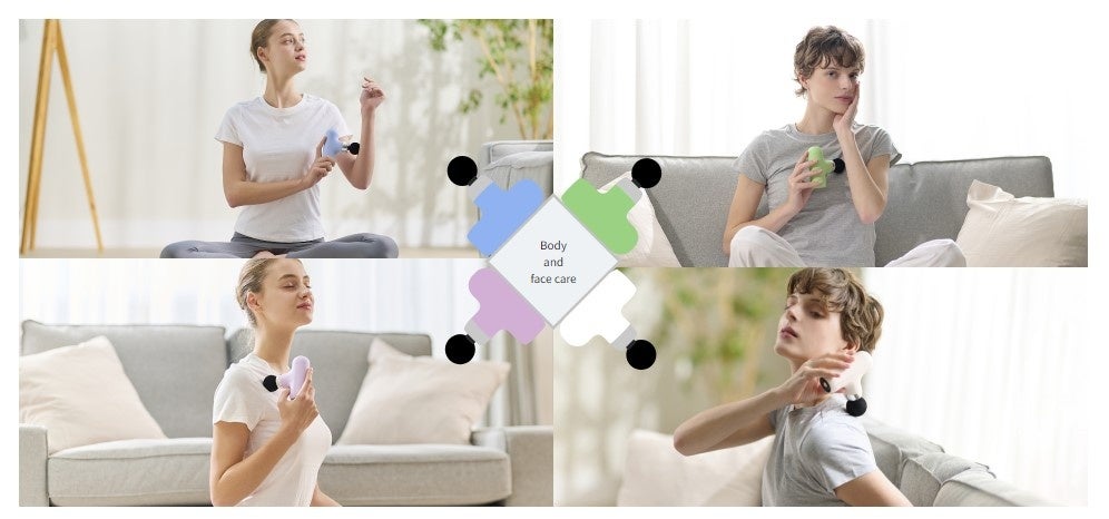 また、付属の〔アタッチメント4種〕と〔4段階の振動〕を組み合わせれば、首、肩・腰・脚・足裏などの様々な部位のボディケアから、フェイスケアといった用途に合わせての使用が可能です。