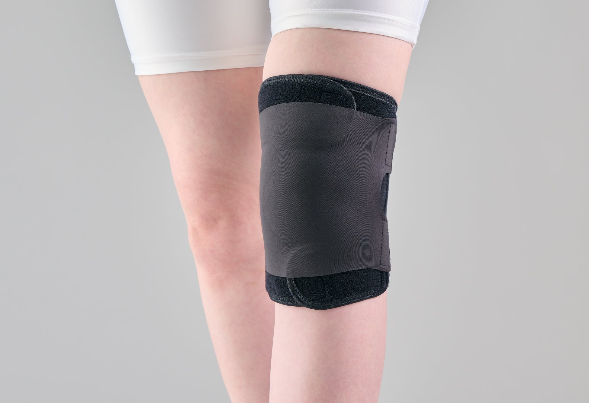 テーピング理論を応用し、大腿四頭筋をサポートするサポーターです。テーピングを再現した3本の伸縮ベルトが大腿直筋・外側広筋・内側広筋をサポートします。