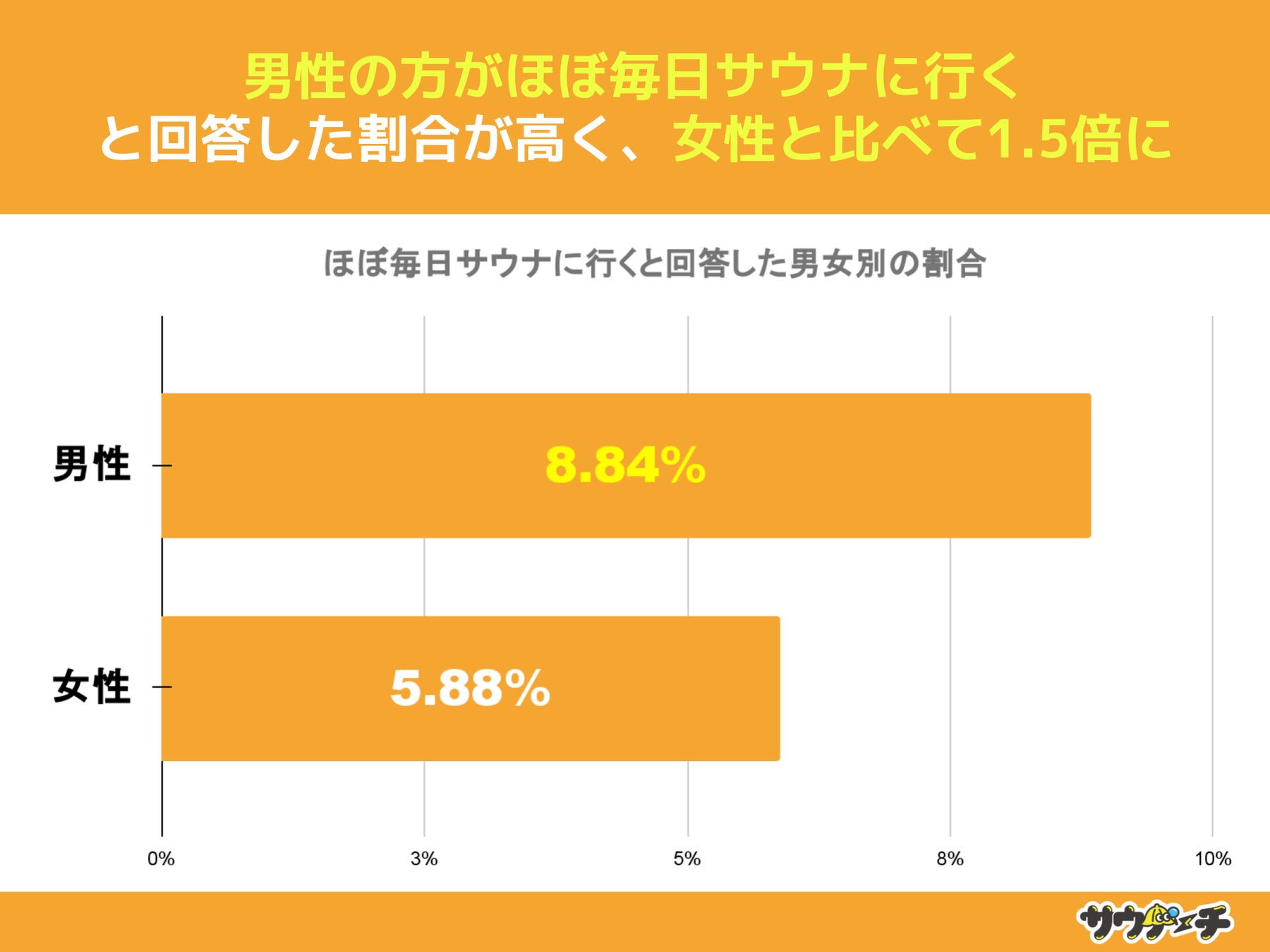 ほぼ毎日サウナに行くと回答した割合を男女別でみてみますと、男性が8.84%、女性が5.88%で、女性と比べて男性は1.5倍高い結果となりました。