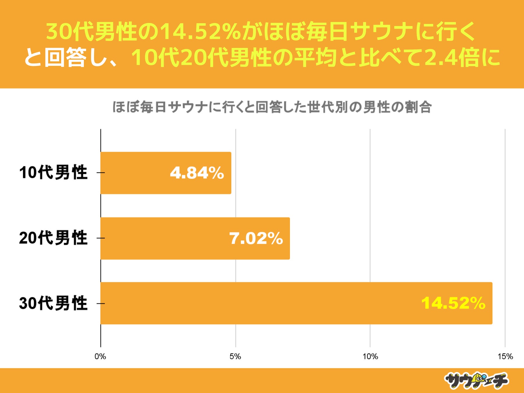 【30代男性の14.52%がほぼ毎日サウナに行くと回答し、10代20代男性の平均と比べて2.4倍に】