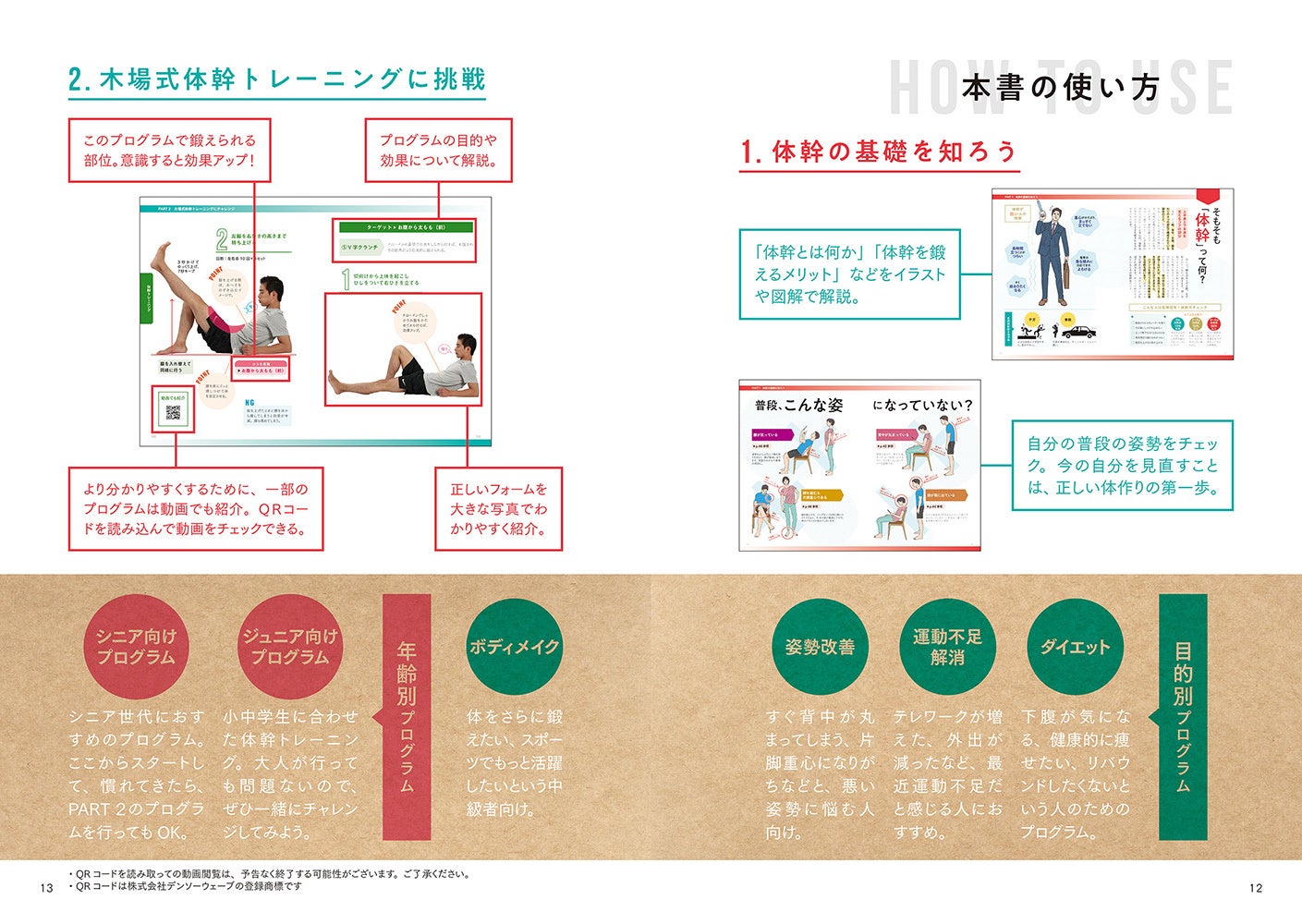 理想のカラダに最短最速で近づく、目的別・年齢別に応じたトレーニングをプログラム化して紹介します。正しいフォームでトレーニングするために、大きな写真でわかりやすく解説します。一部のプログラムではQRコードを読み込んで動画をチェックできます。
