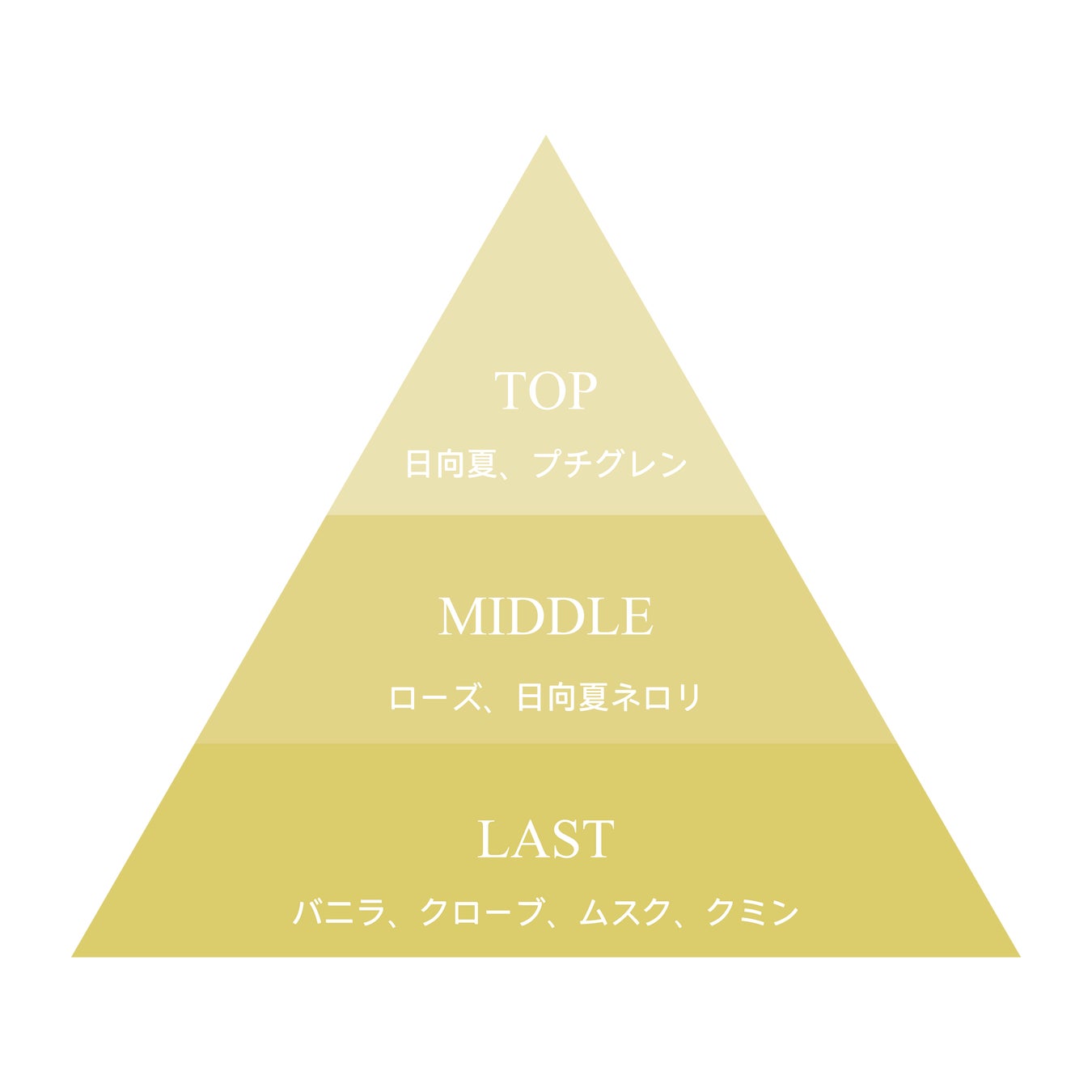 宮崎県産の日向夏精油を配合したフレッシュな柑橘の香りをベースに、日南海岸に吹く潮風を「ムスク」で、南国リゾートにいるような上質感を「バニラ」で表現しています。宮崎は一般的な南国リゾートと異なり、海に近い豊穣(ほうじょう)な大地が特徴で宮崎でしか作ることができない柑橘も数多く存在します。中でも日向夏は江戸時代に偶然宮崎県で発見された柑橘で、太陽に燦々と照らされながら丁寧に育てられています。