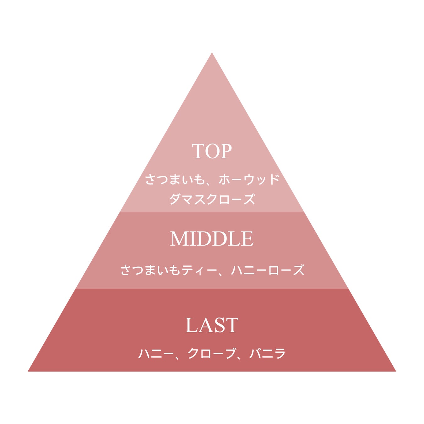 鹿児島県が日本に誇る特産物「さつまいも」は全国生産量日本1位。実は滅多に開花しない「さつまいもの花」はバラのようなフローラルな香りが広がります。さつまいもからのインスピレーションをもとに、フローラルなローズの香りをベースにして鹿児島県産ほうしょう精油と調香した、さつまいものグルマンな甘い蜜感をほんのり感じるフレグランスです。