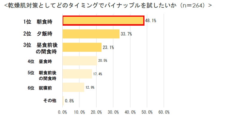 「乾燥肌」対策としてパイナップルを食べて「インナーケア」を試したい人に、パイナップルをどのタイミングで食べたいか聞いたところ、最も多かったのが朝食時に食べる「朝パイン派」(48.1%)で、理由として「朝食べたら吸収率が良さそうだから」や「朝が1番効果がありそうだから」などがあった。次に夕飯時に食べる「夜パイン派」(33.7%)、昼食前後の間食時に食べる「おやつパイン派」(23.1%)と続いた。