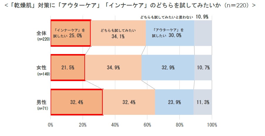 これから乾燥肌対策を行いたいと考えている人に、化粧品や美容液を使った「アウターケア」と肌に良い成分の含まれた食品や食材、サプリなどを摂って肌を内側から整える「インナーケア」のどちらを試したいか聞いたところ、性別では女性(21.5%)より男性(32.4%)、年代別では20代(34.5%)と30代(32.4%)を中心に若い世代ほど「インナーケア」を試したい傾向が 明らかになった。