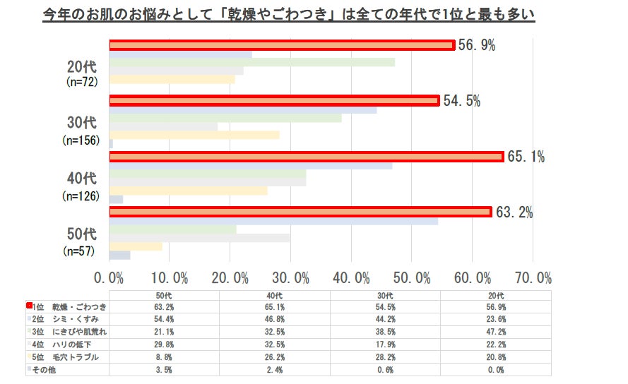 ■今年の肌の悩みの1位は「乾燥やごわつき」。全ての年代で1位となる。